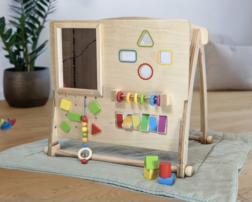 Um die Sinne und Feinmotorik von Kindern zu fördern, kann die „Motorikplatte“ von Leuli eingesetzt werden. Mit Spiegel, Wurfelementen, Ringen und Drehelementen lädt sie zum Entdecken, Greifen und Ausprobieren ein. Während des Spiels unterstützt sie spielerisch die sensorische Wahrnehmung, regt die Neugier an und fördert gezielt motorische Fähigkeiten. © Leuli
